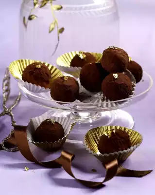 Roll into approx. 25 small balls with cool hands. If the mixture is too soft, refrigerate again. Roll the chocolates in the cocoa. Place on baking paper and chill for about 2 hours. Finally, use tweezers to place the gold leaf on the pralines. Store in a cool and dry place