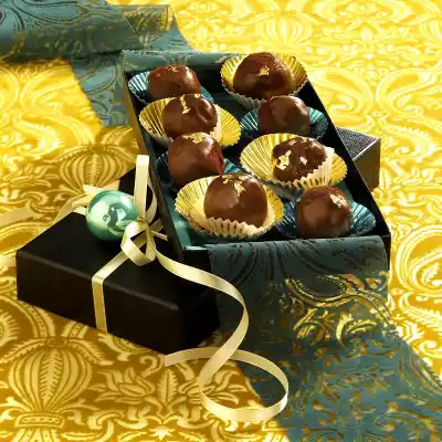 Chop 200 g chocolate and melt with coconut oil over a warm water bath. Dip the balls individually into the chocolate, drain well and place on a tray with baking paper. Decorate with gold leaf before the chocolate becomes solid. Leave to dry. Dust half of the balls with cocoa. Store balls in a cool and dry place