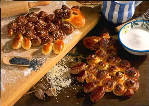 Spread with egg yolk and sprinkle with sesame seeds. Stick a peeled almond on as an eye. Bake the second sheep like the first one. Leave to cool on cake racks. Serve as fresh as possible with butter and jam.