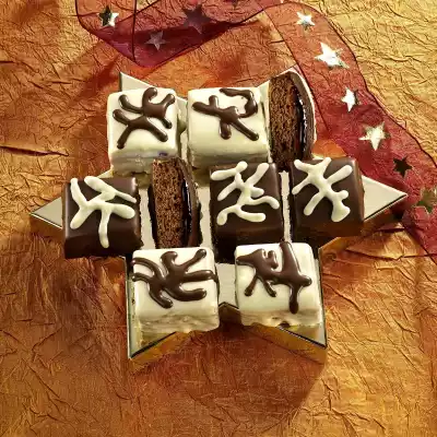 Chop the dark and white couverture separately. Add 10 g coconut oil to each and melt carefully over a hot water bath. Dip half of the cubes in dark chocolate, the other half in white couverture. Place the cubes on a cake rack and allow to dry. Pour the rest of the couverture into 2 disposable piping bags, cut off a small tip and spray patterns onto the cubes. Allow to dry