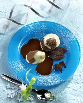 Stir in 30 ml orange liqueur. Leave to cool down a little. Cut off cams from the mousse using 2 tablespoons, which are dipped repeatedly in hot water, and place them on 4 plates. Carefully remove the leaves from the chocolate. Serve the mousse with sauce and chocolate leaves. Dust plates with icing sugar