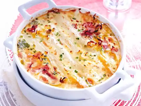 Cut the leek half lengthwise and wash thoroughly. Cut the leek into thin rings. Cut ham into small pieces. Heat oil in a pan. Lightly fry the leek and ham in it, season with salt and pepper. Take out and distribute on 4 small or 1 large greased casserole dish. Drain the asparagus and place on top