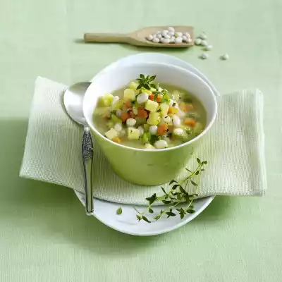 Cover beans with water and soak overnight. Melt margarine in a pot. First sauté onion cubes in it, then add half of the potato cubes and beans (with soaking water). Deglaze with broth and cook for 45-60 minutes until soft. Add carrot, celery and other potato cubes about 10 minutes, leek about 5 minutes before the end of cooking time. Wash the savory, dab dry and finely chop leaves from a stalk. Season to taste with savory, salt and pepper and garnish with savory