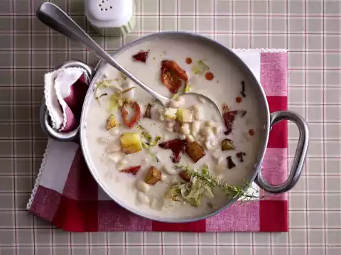 Add paprika and leek and continue to fry for 3-4 minutes. Remove thyme from the pot. Puree the soup with the cutting stick. Add potatoes, leek and paprika. Season to taste with salt, pepper, sugar and some lemon juice.