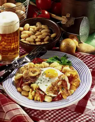 Season the bean vegetables to taste and possibly crush them coarsely. Distribute on plates. Arrange fried eggs on top and sprinkle with bacon and onion rings. Garnish with parsley if desired.