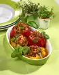 Heat 1-2 tablespoons of oil. Sauté the onion cubes in it. Add the beans, tomatoes and garlic and fry for 3-4 minutes, turning. Add 175 ml water. Bring to the boil and stir in stock. Let everything simmer at low heat for about 7 minutes