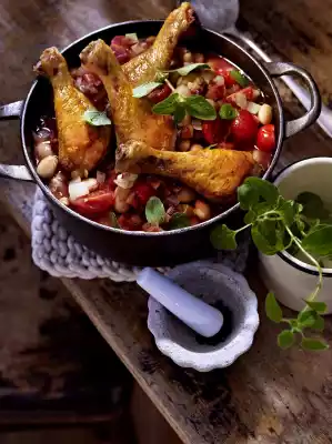 Add chicken legs, beans and bacon to the pot and simmer for about 30 minutes. Wash and halve the tomatoes and add them about 3 minutes before the end of cooking time. Wash marjoram, shake dry and pluck leaves from the stalks. Arrange the finished stew and sprinkle with marjoram
