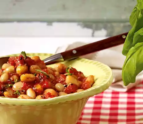Add the beans and thyme to the tomato sauce and bring to the boil. Simmer for about 2 minutes. Season to taste again. Let the beans cool down and sprinkle with 2-3 tbsp. oil before serving.