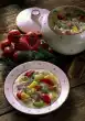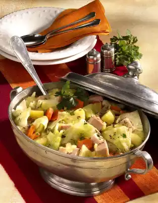 Cut the cabbage quarters into strips. Peel, wash and cut the potatoes into pieces. Peel, wash and slice carrots. Add cabbage, potatoes, carrots and caraway seeds to the meat about 20 minutes before the end of the cooking time.