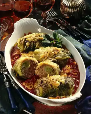 Clean and wash the cabbage and remove 8 large leaves. Blanch cabbage leaves briefly and rinse under cold water. Cut leaf veins a little bit flatter. Cut the rest of the cabbage in half. Cut one half into pieces. (Use the rest of the cabbage for other purposes.) Peel and finely chop the onions. Knead minced meat, half of the onions, curd and breadcrumbs.