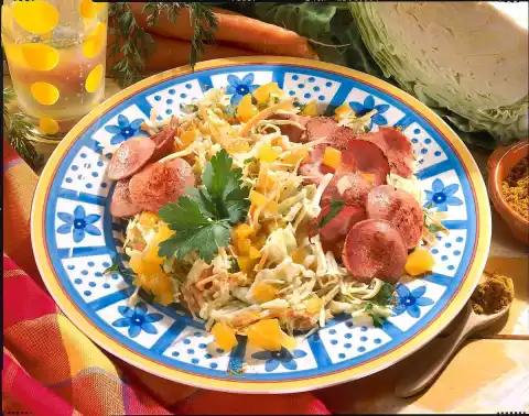 Clean and wash the white cabbage, cut into slices and remove the stalk. Clean and wash the carrots. Slice white cabbage and carrots into thin strips. Mix with fruit vinegar and 1 tablespoon of oil. Season with salt, pepper and curry. Drain the apricots, collecting the juice. Chop the apricots.