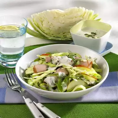 Wash apples, quarter them, remove seeds. Cut the fruit flesh into fine slices and sprinkle with 2 tablespoons of lemon juice. Mix spring onions and apples with the cabbage. Wash chives, cut into small rolls.
