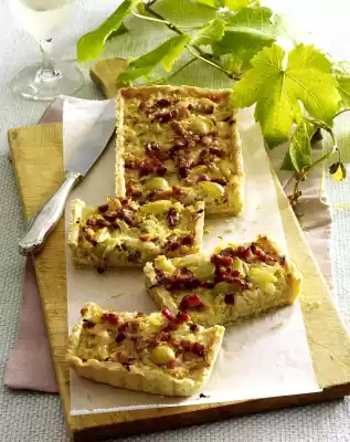 Grease a rectangular tart with lift-off base (11.5 x 35 cm). Roll out the short pastry rectangularly (approx. 13 x 38 cm) on a floured work surface. Line the tart mould with the pastry and press the dough up at the edges. Place a piece of baking paper on the dough. Spread dry peas on top. Bake in the preheated oven (electric cooker: 175 °C/ convection oven: 150 °C/ gas: see manufacturer) for about 15 minutes. Remove baking paper with dry peas