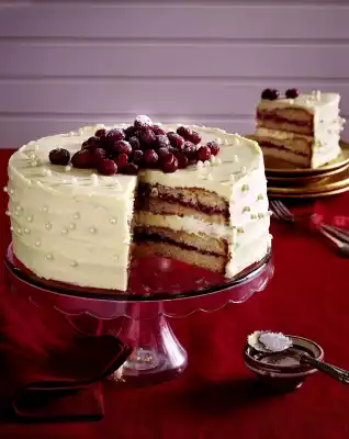 Put the cranberries in a sieve and let them drain. Carefully press the sugar pearls evenly onto the edge of the cake and spread them on the surface. Spread the cranberries on the surface and dust with icing sugar.