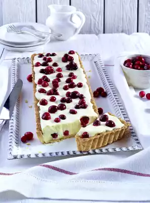 Spread half the cranberries on the tart base. Spread the cream over it and smooth it down. Spread the rest of the cranberries on the cream. Arrange on a cake plate.
