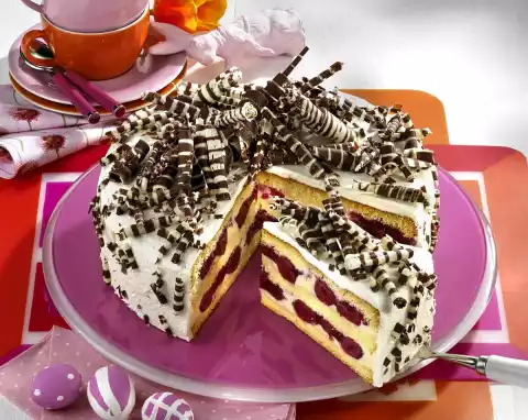 White chocolate cream cake with cherries