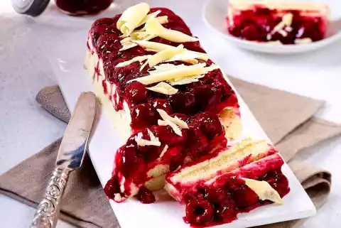 Peel chips from the remaining chocolate coating with a peeler. Remove the upper layer of foil. Turn the layered food onto a plate, remove the remaining foil. Sprinkle with chocolate shavings.