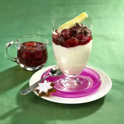 Add to the juice while stirring and bring to the boil again. Simmer for at least 2 minutes. Stir in the cherries and allow to cool slightly, then remove the chocolate shavings from the white chocolate coating with a spatula. Sprinkle star anise with water and roll in sugar. Arrange the white chocolate mousse and warm cinnamon cherries with the chocolate shavings and sugared aniseed stars. Cinnamon stars taste good with it
