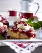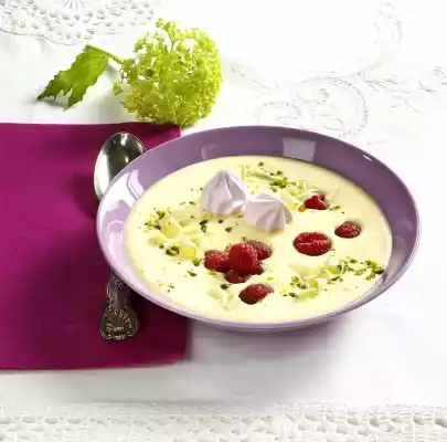 Remove from the stove. Add couverture and dissolve while stirring. Whip cream until half stiff and fold into the hot soup. Divide into deep plates, add raspberries to the soup and sprinkle with pistachios. Decorate with meringue tuffs. Cut fine rolls from the chocolate with a peeler. Finally sprinkle over the soup and serve immediately