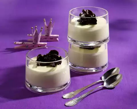 Whip cream until stiff and fold in. Pour into 4 glasses (200 ml each) and chill for approx. 2 hours. Chop the dark chocolate coating and melt over a warm water bath. Roast almonds in a pan without fat. Sprinkle 1 tablespoon of sugar on top and let it caramelize while stirring. Spread the almonds on a piece of aluminium foil lightly coated with oil and let it cool down. Rub the almonds together with your fingers so that they separate. Mix with cornflakes in a bowl. Pour in the couverture and mix in. Place small heaps on baking paper with 2 teaspoons and let them dry.