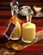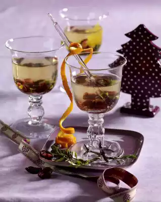 Simmer white wine, grape juice, Glühfix and sugar for 2-3 minutes. Add pistachios and cranberries. Fill orange corners into glasses. Pour in hot mulled wine and decorate with the orange spiral