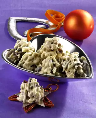 Roast the pine nuts in a pan without fat until light brown, take them out. Chop white couverture and melt with coconut oil on a hot water bath. Pour 2 tablespoons of this into a small piping bag with a perforated spout. In the meantime, dice the plums a little smaller. Mix pine nuts, plums and smacks into the chocolate coating. Place crossies with a teaspoon on trays covered with parchment paper. Decorate with couverture from the piping bag and let dry