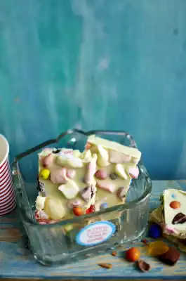 Mix chocolate-coated peanuts, confectionery and mice into the cooled couverture. Distribute evenly in the mould. Chill for at least 3 hours. Serve cut into pieces.