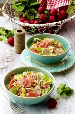 Clean the salad, wash and shake dry well. Cut lettuce into strips. Cut cheese into fine sticks. Cut white sausages into slices. Wash sprouts and drain well.
