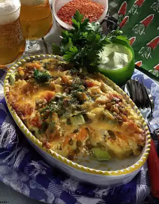 Pour over the casserole and sprinkle with cheese. Bake in the preheated oven (electric cooker: 200°C/ gas: level 3) for approx. 25 minutes. Wash the parsley and chop it and sprinkle it over the casserole except for something to garnish.