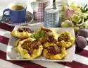 Press the dough over the filling to form small bags. Wrap 2 of the remaining chive stalks around each bag and tie up. Whisk the egg yolk and 1 tablespoon of water and brush the sachets with it. Place on a baking tray lined with baking paper and bake in a preheated oven (electric range: 175 °C/ gas: level 2) for approx. 30 minutes. Clean and wash the frisée salad and place it on a serving dish. Cut the rest of the tomato into eighths. Arrange the pastry bag and tomato cake on the salad and serve
