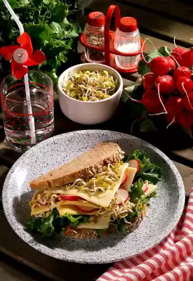 Wash and drain the salad. Put the sprouts on a sieve, rinse with cold water and also drain. Wash radishes and cut into thin slices. Season tartar sauce with a little sweet paprika. Spread it on bread slices. Cut cheese slices diagonally in half. Place salad, sprouts, cheese and radishes alternately on one slice of bread. Place the remaining slice of bread on top