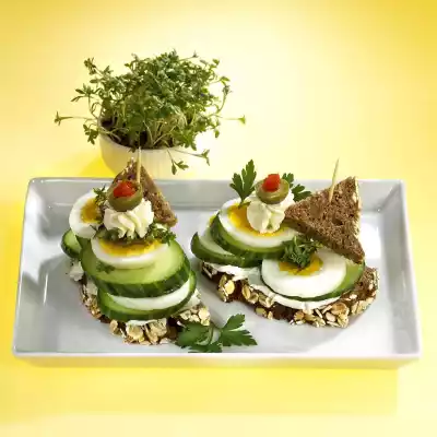 Boil eggs for about 9 minutes. Then rinse with cold water, peel and cut into slices. Wash cucumber and cut into slices. Cut cress briefly from the bed. Mix salad cream and quark. Season with salt and pepper. Fill 1 tablespoon into a piping bag with star-shaped spout.