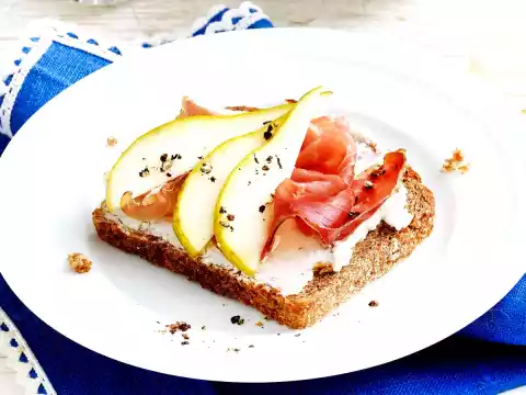 Spread bread with cream cheese, place ham on top and garnish with pear wedges in a fan shape. Sprinkle with pepper.