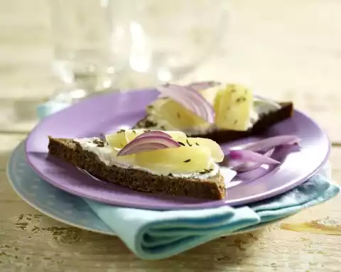 Peel the onion and cut into thin slices. Cut the cheese into slices. Season quark with salt and pepper. Cut the bread slice diagonally in half. Spread with quark. Cover bread with cheese and onions.