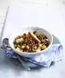 Cut the vanilla pod lengthwise and scrape out the pulp. Put sugar, syrup, oil, plum puree, egg white, egg, vanilla pulp, oat flakes, oat bran, flour and baking powder into a mixing bowl. Finely dice the apricots and add.