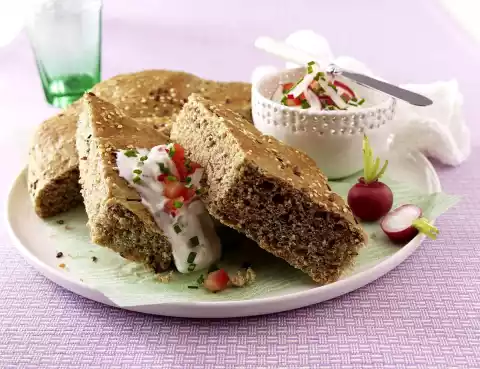 Mix 1 tablespoon milk and 1 tablespoon oil. Spread bread with it. Sprinkle with remaining sesame and linseed. Bake in the preheated oven (electric cooker: 200 °C/circulating air: 175 °C/gas: level 3) for 18-20 minutes.
