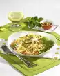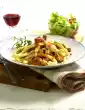 Meanwhile, prepare the pasta in boiling salted water according to the instructions on the packet. Season the sauce with salt, pepper and a little sugar. Drain the noodles and arrange on plates with the sauce, meat and vegetables