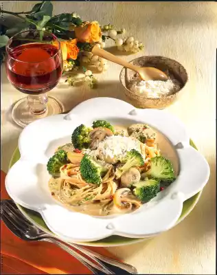 Season with salt and pepper. Add soaked mushrooms with the liquid and cream, bring to the boil. Fold in broccoli, add sauce thickener, bring to the boil again and season to taste. Arrange noodles and sauce in portions.