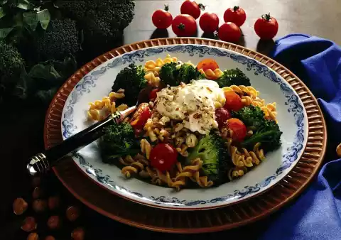 Clean and wash the broccoli and cut it into small florets. Steam in little boiling salted water for about 10 minutes. Then let it drip off. Cook the pasta in boiling salted water for about 10 minutes. Then rinse cold and drain. Wash and halve the tomatoes.
