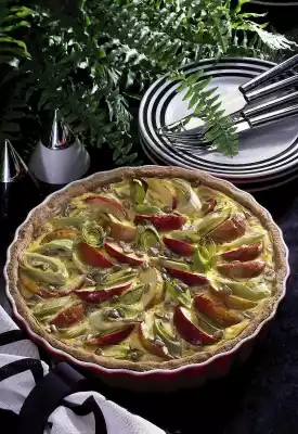 Quickly work the flour, fat, egg yolk and 1 pinch of salt into a smooth dough. Cover and chill for 30 minutes. In the meantime clean, wash and cut the leek into rings. Wash apples, remove core and cut into slices. Mix eggs and sour cream, season with salt and pepper. Roll out dough between 2 layers of cling film to a circle (approx. 28 cm Ø). Grease the pie dish (26 cm Ø) and line with dough. Add apple slices and leek. Sprinkle 1 tablespoon of sunflower seeds on top. Sprinkle with egg sour cream. Add the remaining seeds and bake in the preheated oven (electric cooker: 200 °C/ gas: level 3) for approx. 35 minutes