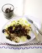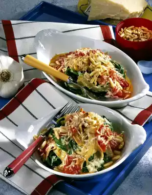 Pour the pasta into ovenproof, greased moulds. Add the prepared tomato mixture. Sprinkle with pine nuts and parmesan. Bake in the preheated oven (electric range: 225 ° C/ convection oven: 200 ° C/ gas: level 4) for approx. 5 minutes