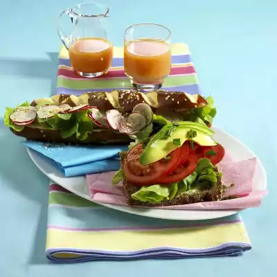 Clean and wash the radishes and slice them into thin slices. Roast sesame seeds in a pan without fat, let cool. Spread a thin slice of bread with margarine. Cover with half of the lettuce, the tomatoes and avocado.