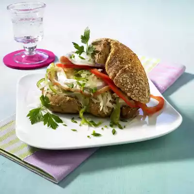 Gently squeeze the salad with your hands. Cut the roll open horizontally. Lay some cabbage salad, 2/3 of the roast cutlet, some of the horseradish cream, remaining cabbage salad, paprika, remaining roast cutlet and remaining horseradish cream on the lower half of the roll one after the other.