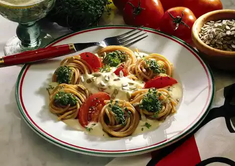 Roast the sunflower seeds in a dry pan until golden brown. Rinse cress under running water. Drain spaghetti on a sieve, arrange on plates with tomatoes and sauce. Garnish with cress and sunflower seeds.