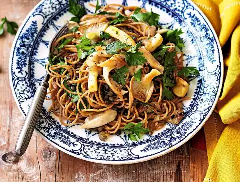 Add 2 teaspoons of salt to the boiling lentil water. Cook the noodles in it according to the package instructions until firm to the bite. Heat the oil in a wide frying pan. Sauté the shallots and garlic over medium heat for about 1 minute.