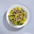 Rinse the turkey filet, dab dry and cut into small cubes. Heat the fat in a coated pan. Fry the meat cubes on medium heat all around for about 5 minutes, season with salt and paprika, take out.