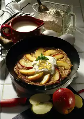 Place the apple slices in the semi-solid dough. Bake on each side for 2-3 minutes until golden brown. Do the same with the remaining oil and dough. Serve each pancake with some curd cheese. Garnish with grated lemon and lemon balm.