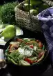 Cut quarters into slices and sprinkle with remaining lemon juice. Stir eggs and baking powder into the dough. Heat 1 tablespoon of soya oil in a frying pan. Fry 1/4 of the dough in it to a pancake.