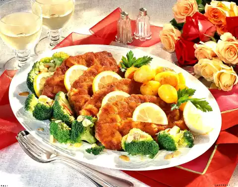 Cook broccoli in little boiling salted water for about 6 minutes. Pour broccoli onto a sieve and drain. Foam the remaining fat briefly in a frying pan, toss the broccoli and flaked almonds in it. Keep vegetables and potatoes warm. Heat the oil in 1 or 2 frying pans and fry the escalopes for 4-5 minutes, turning them over until golden brown. Arrange on a plate together with broccoli and roast potatoes. Serve decorated with parsley, lemon slices and slices