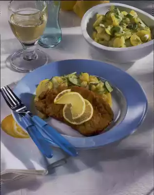 Pour the marinade over the potato slices. Clean and wash spring onion and cut into rings. Wash and quarter the cucumber and cut into slices. Add both to the potatoes and mix well, season to taste. Heat the remaining oil in a large frying pan and fry the escalopes for 3-5 minutes on each side until golden brown. Wash and slice the lemon. Arrange potato salad and schnitzel on plates and garnish with the lemon slices. Sprinkle with chopped dill as desired